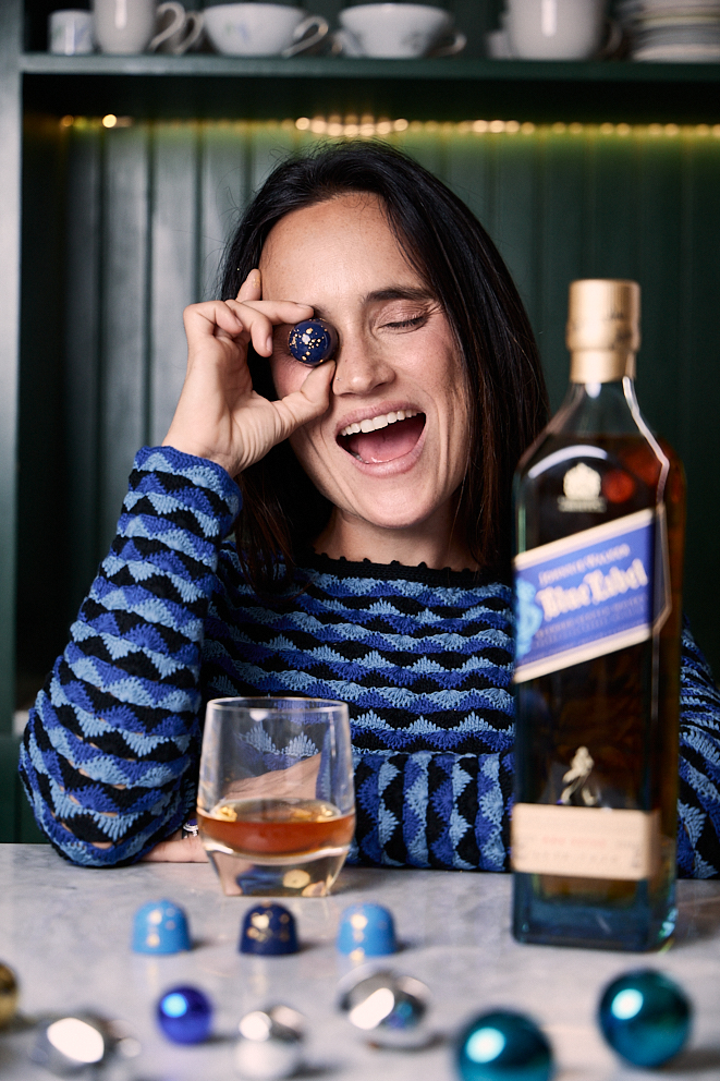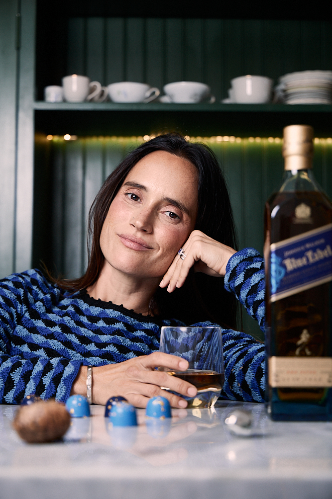 Por su parte, ella asumió este reto creativo dando vida a una edición limitada de bombones inspirados en las notas de Blue Label: tabaco, sándalo, chocolate bitter, avellana, naranja, jerez, manzana, pétalos de rosa y scotch. Cada una de estas notas ha sido cuidadosamente interpretada por Sabina para crear dos bombones que destacan por su originalidad, balance y sofisticación.